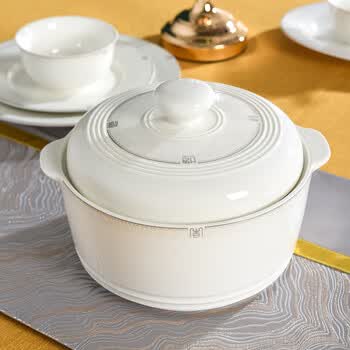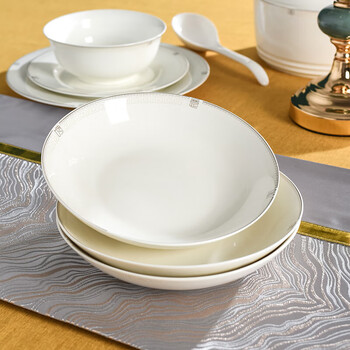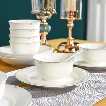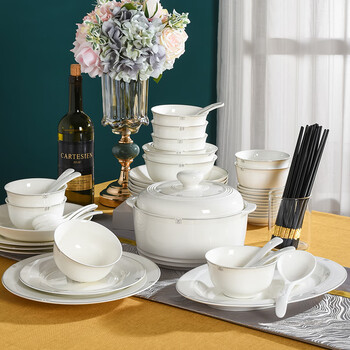 12.5英寸鱼盘*1 品锅*1 6英寸面碗*2 10英寸大盘*1 大汤勺*1 4.5英寸饭碗*10 8英寸浅盘*4 小勺*10 合金筷*10 8英寸深盘*6 圆碟*10