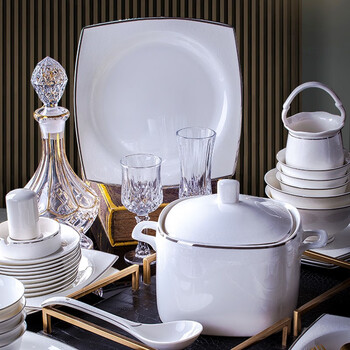 天元煲1个、日式鱼盘1个、天元大平盘1个、天元深盘6个、天元浅盘4个、面碗2个、饭碗10个、骨碟10个、大勺1个、小勺10个、花篮1个、天鹅1个、牙签筒1个、烟灰缸1个、合金筷子10双