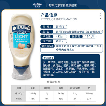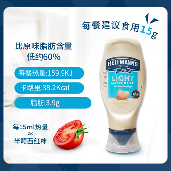 好乐门Hellmanns 西班牙进口 淡味蛋黄酱 轻食沙拉酱 432g