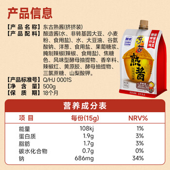 东古 熟酱500g挤挤装 豆瓣酱东北大豆酱拌饭酱拌面酱卷饼酱调味酱