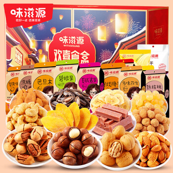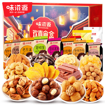 腰果120g 熟核桃120g 夏威夷果120g 巴旦木120g 碧根果120g 芒果干120g 香蕉片120g 山楂条120g 多味花生120g 焦糖瓜子120g 蟹黄豆瓣120g 陈皮糖120g
