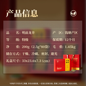 龙井茶叶200g,礼盒*1,礼品袋*1