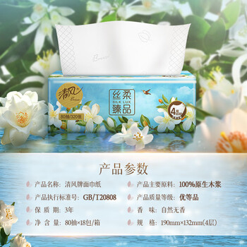 清风抽纸 丝柔臻品4层80抽*18包S码 卫生纸 餐巾纸 纸巾加厚 抽纸整箱