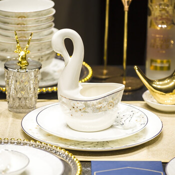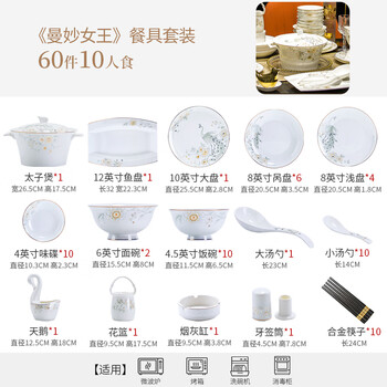 太子煲1个、日式鱼盘1个、月光大盘1个、呙盘6个、浅盘4个、面碗2个、饭碗10个、味碟10个、大汤勺1个、小汤勺10个、天鹅1个、花篮1个、烟灰缸1个、牙签筒1个、合金筷子10双