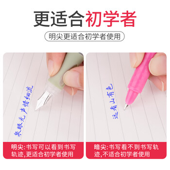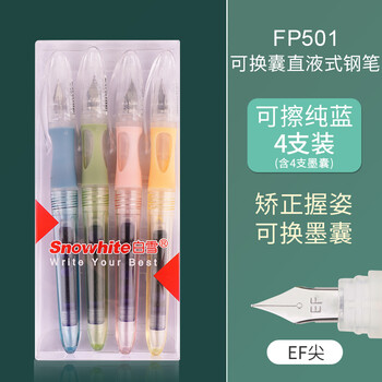 白雪(snowhite)钢笔小学生0.38mm正姿练字钢笔三年级可换墨囊直液式钢笔 化学可擦蓝色4支/盒FP501
