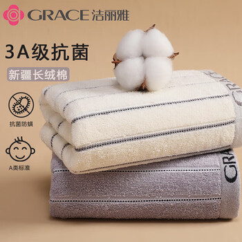 洁丽雅(Grace)毛巾纯棉7A抗菌A类男士洗澡成年人新疆长绒棉毛巾 2条装