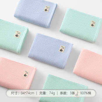 新亚毛巾纯棉华夫格毛巾3条吸水速干纱布洗脸巾手巾洗澡毛巾34×74cm
