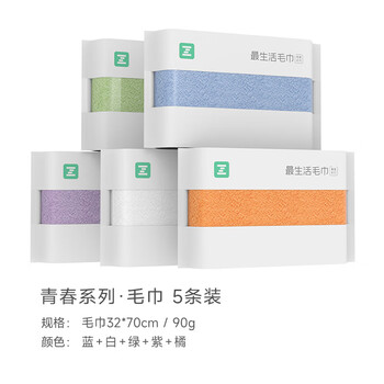 毛巾*5条【净重90g, 尺寸32*70cm, 白绿蓝紫橘】