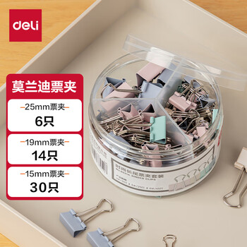 得力(deli)50只莫兰迪色多规格套装 彩色长尾夹/燕尾夹 (25mm6只 19mm14只 15mm30只)/筒8520A