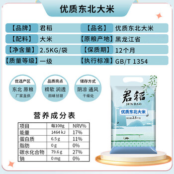 君稻东北大米5斤一袋 真空装 珍珠米2.5kg 圆粒粳米 自营