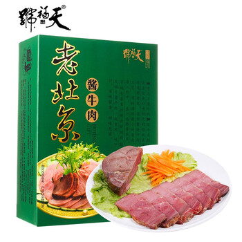 【品名】:天福号 老北京酱牛肉 【净含量】:200g 【配料】:牛肉、水、食用盐、酱油(含 焦粮色)、黄酱、白酒、香辛料、大豆蛋白、白砂糖、味精、葡萄糖、食品添加剂 【保质期】:270天 【执行标准】:GB/T 23586 【食品生产许可证号】:SC10411130411629 【贮存条件】:常温保存,开封后需冷藏 【食用方法】:开袋即食或除去包装后加热食用 【警示】:胀袋(发酸)勿食