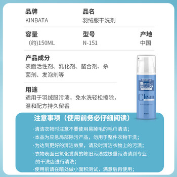 KINBATA日本羽绒服清洗剂150ml*2瓶干洗剂顽固污渍去油渍免水洗强力去污