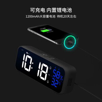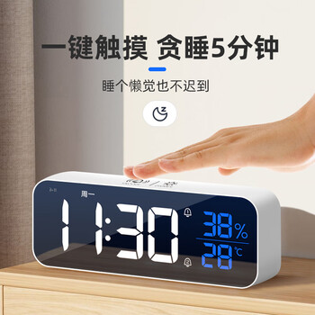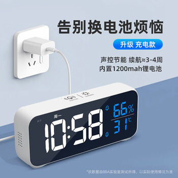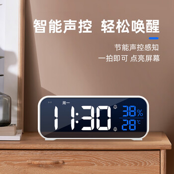 码仕闹钟学生儿童温湿度计电子智能简约夜光LED声控大音量电子钟8820白色开学季礼物