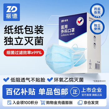 振德一次性医用外科口罩独立包装成人儿童灭菌级防晒口罩防花粉尘50只