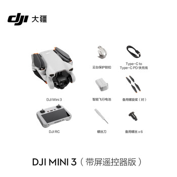 DJI Mini 3×1、DJI RC×1、智能飞行电池×1、备用螺旋桨(对)×1、备用螺丝×6、螺丝刀×1、云台保护锁扣×1、Type-C to Type-C PD 快充线 ×1、