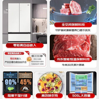 海尔冰箱505升十字四开门玻璃门零嵌入式全空间保鲜一级能效风冷无霜BCD-505WGHTD14GXU1