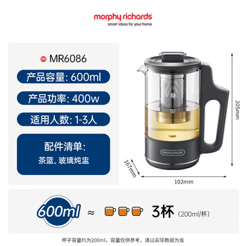 摩飞电器(Morphyrichards)养生壶便携煮茶器烧水壶养生杯小型办公室家用多功能煮茶壶一体热水壶0.6L MR6086 灰