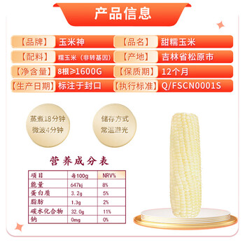 玉米神甜糯白玉米棒8根≥3.2斤/1600g新鲜粘香东北鲜食真空锁鲜早餐粗粮