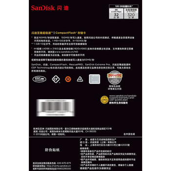 闪迪(SanDisk)128GB CF(CompactFlash) 内存卡 4K 3D UDMA-7 至尊超极速相机存储卡 读速160MB/s 写速150MB/s