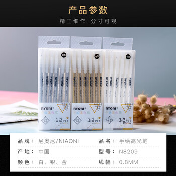 尼奥尼(NYONI)高光笔勾线笔白色0.8mm手绘漫画描边笔绘画美术专用儿童DIY手账黑卡纸记号笔12支装N8209