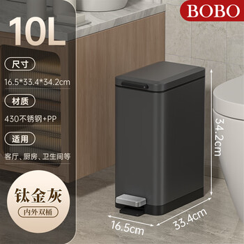 BOBO不锈钢垃圾桶10L钛金灰卫生间夹缝脚踏式厕所脚踩客厅厨房8877