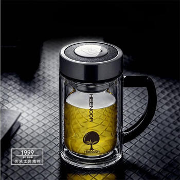 希诺(heenoor)双层玻璃杯茶杯办公杯带过滤杯男士防烫口杯水晶杯带手柄 435毫升