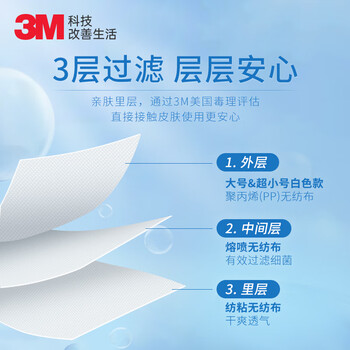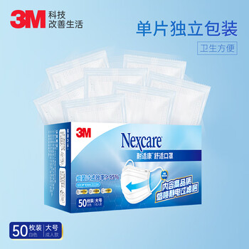 3M口罩独立包装 一次性成人口罩细菌过滤率95% 平面舒适口罩50只