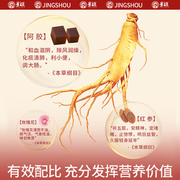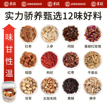 阿胶;人参;枸杞子;甘草;黄精;龙眼肉(桂圆);佛手;干姜;玫瑰花