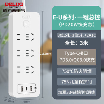 德力西(DELIXI) 20W PD快充插座/插线板/插排/接线板 Type-c口+USB口+6插孔全长3米 总控开关