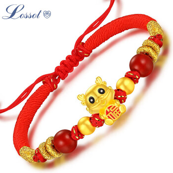Lossot生日礼物本命年十二生肖龙足金福龙金珠黄金转运珠手链金龙红绳