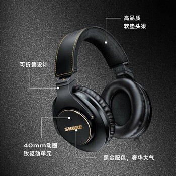SHURE舒尔 SRH840A 专业录音头戴式监听耳机 隔音降噪 40mm动圈钕驱动单元 黑金配色
