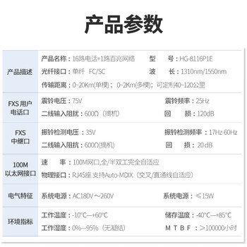 慧谷 电话光端机16路电话+1路百兆网络 PCM语音光端机 电话光纤收发器延长器 SC接口 HG-8116P1E
