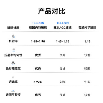 泰迅采用的镜片为肖特玻璃材质,折射率1.45~1.9,具备极好的色散性,色彩还原准确、低光线干扰,有效提高成像质量和镜片使用寿命。