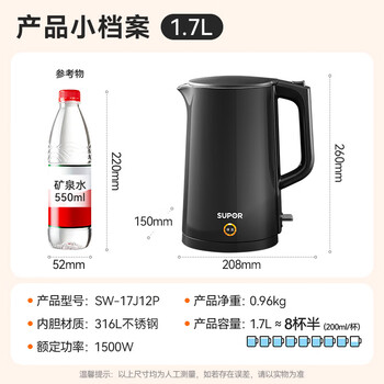 苏泊尔(SUPOR)电水壶热水壶 1.7L大容量全钢无缝电热水壶 316L不锈钢烧水壶 一键保温恒温 SW-17J12P