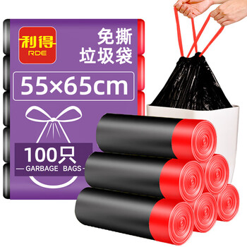 利得抽绳垃圾袋黑色55*65cm100只单面1.3丝大号加厚免撕厨房自动收口