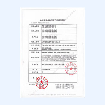 | 结构及组成 | 该产品为增强着色日戴型软性亲水接触镜。镜片由HEMA、NVP、EGDMA、GMA、MA、TRISS、 AIBN聚合而成,添加着色剂,聚丙烯盒包装。含水量标称值: 43%。推荐更换周期一个月。产品经蒸汽湿热灭菌。货架有效期五年。 |