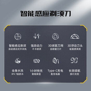 剃须刀*1、刀头保护盖*1、旅行盒*1、充电器*1、充电线*1、保修卡*1、说明书*1、手提带*1