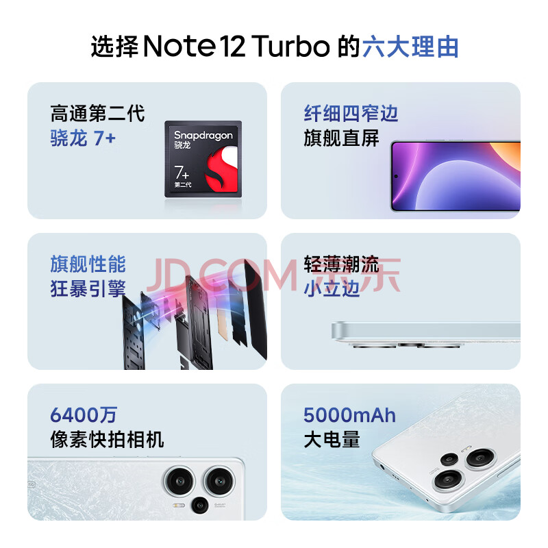 商品相册:小米(MI)Redmi Note 12 Turbo 5G 第二代骁龙7+ 超细四窄边OLED直屏 6400万像素 12GB+256GB冰羽白小米红米第