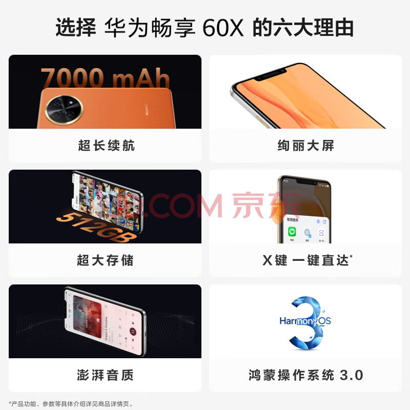 商品相册:华为畅享 60X 7000mAh长续航 6.95英寸 影音大屏 256GB 曜金黑 鸿蒙智能手机HUAWEI第