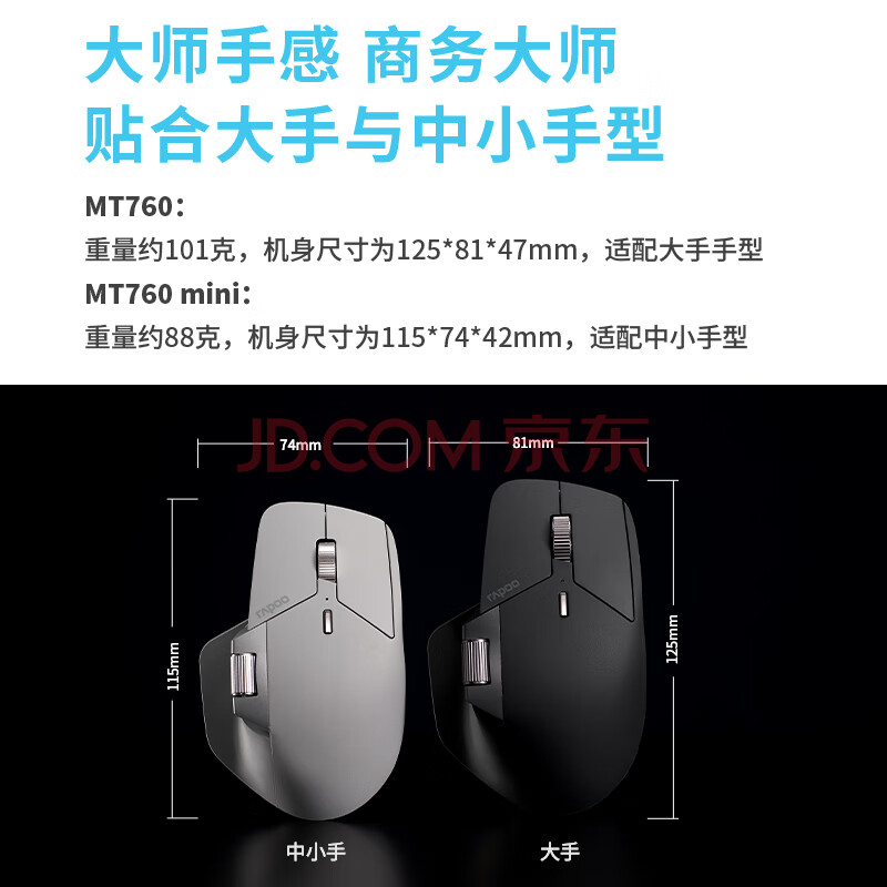 商品相册:雷柏(Rapoo) MT760大手无线/蓝牙/有线多模办公鼠标 跨屏传输人体工学轻音按键11键可定义150小时续航 黑色第