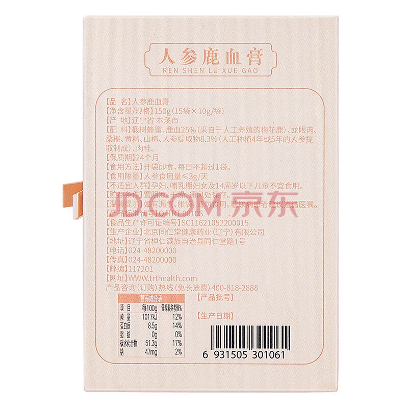 商品相册:同仁堂品牌 北京同仁堂人参鹿血膏150g膏方含黄精鹿血男性滋补独立袋装第1张/共8