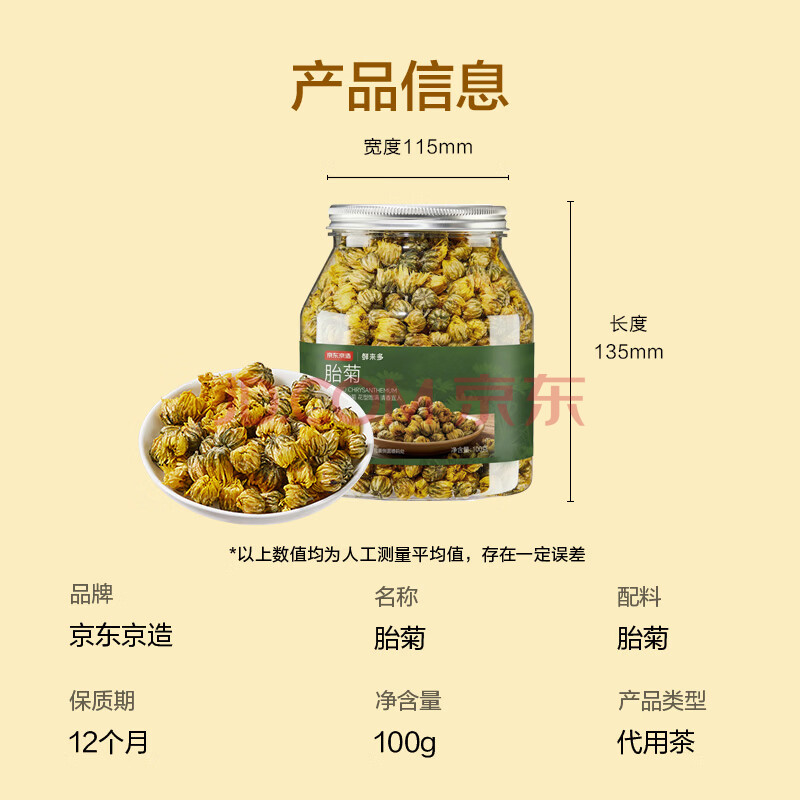 商品相册:京东京造鲜来多 杭白菊花茶胎菊100g量贩装京东自营桐乡清花草茶养生茶第