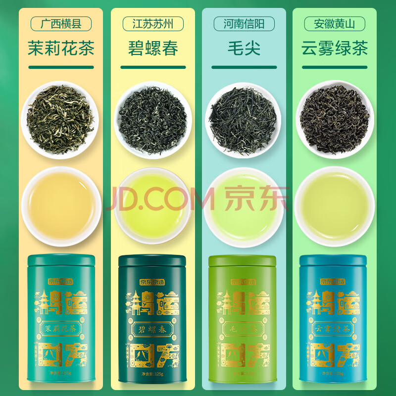 商品相册:京东京造鲜来多鸿运四大绿茶500g碧螺春毛尖茉莉花茶礼盒茶叶送礼茶叶自营第