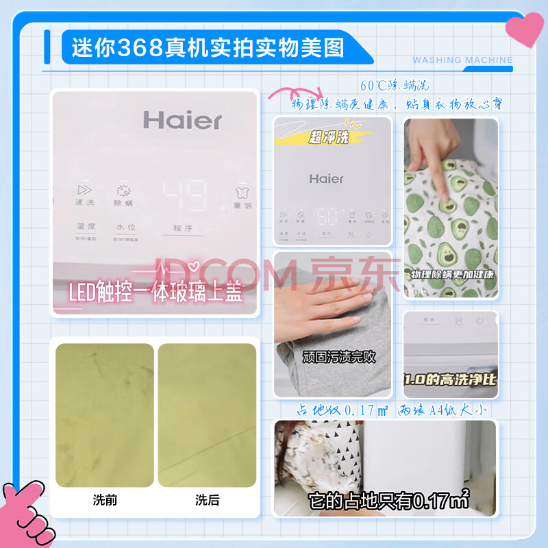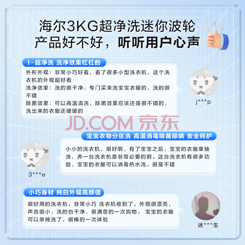 商品相册:海尔(Haier)迷你波轮全自动洗衣机 3KG小型婴儿内衣洗 高温除菌 租房一人 家用家电补贴XQBM30-R368第