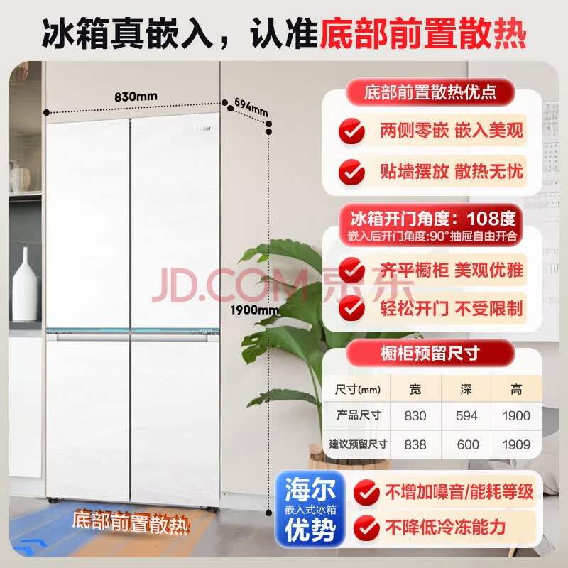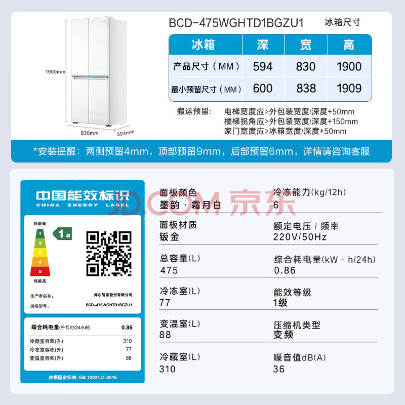 商品相册:海尔(Haier)475升山茶花全空间保鲜594mm超薄零嵌入式十字电冰箱家用一级能效BCD-475WGHTD1BGZU1第