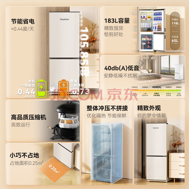 商品相册:荣事达(Royalstar)183升小冰箱小型家用出租房办公室宿舍双开门两门双门二门电冰箱节能省电低音白色BCD-183L9RSZ第