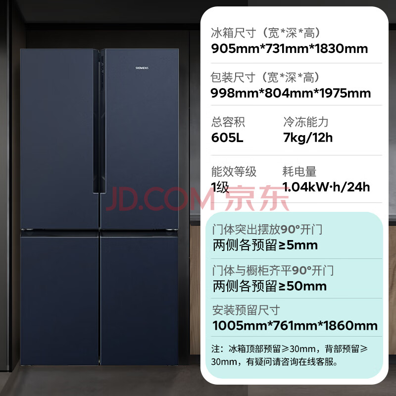 商品相册:西门子(SIEMENS)保鲜大怪兽605L十字门冰箱 超大容量 精准保鲜 一级能效 无霜冷藏湖蕴蓝K56L56CMEC 第