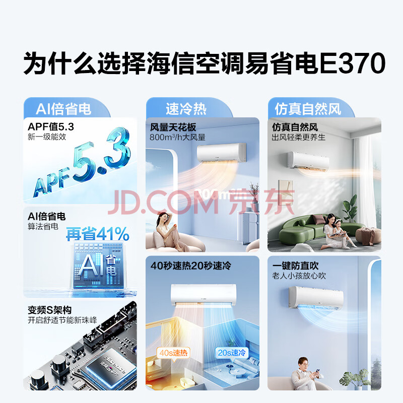 商品相册:海信空调易省电E370 大1匹 AI省电 速冷热 仿真自然风 1级能效 纯铜管空调挂机KFR-26GW/E370-X1第