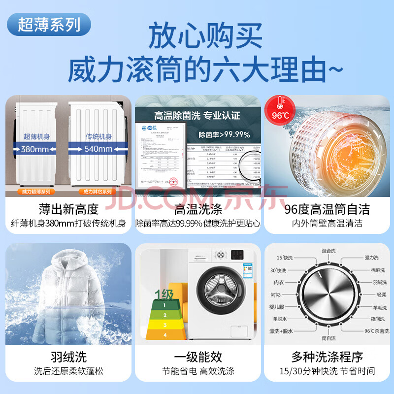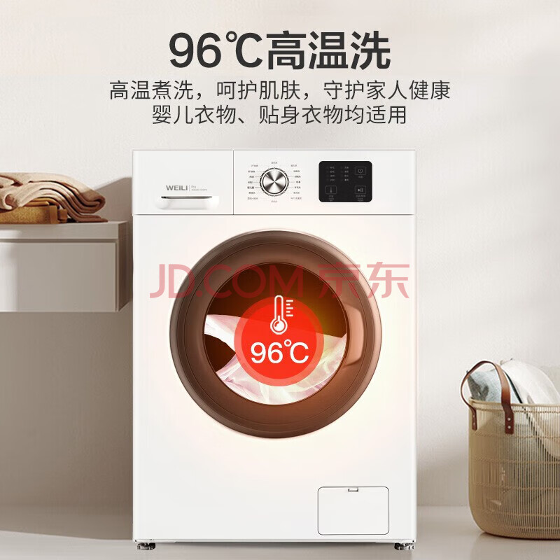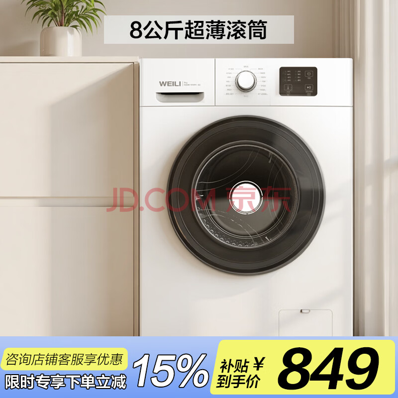 商品相册:威力(WEILI)滚筒洗衣机 8KG全自动 超薄机身一级能效 高温除菌15分钟快洗 XQG80-1016PX送装一体第
