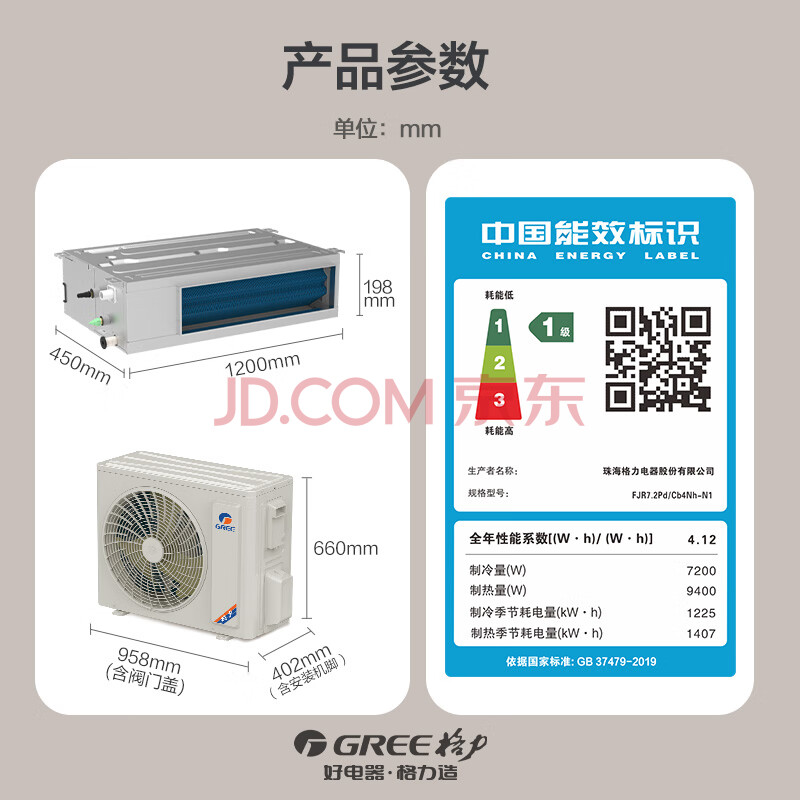 商品相册:格力中央空调 风静享3匹风管机 一级能效 纯铜管FJR7.2Pd/Cb4Nh-N1 一价全包 精工安装第